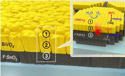 우리 학교 조인선 교수(신소재공학과, 사진) 연구팀이 세계 최고 수준의 태양광-수소 전환 효율을 갖는 전극 소재를 개발하는 데 성공했다.조인선 교수와 샤올린 쳉(Xiolin-Zheng) 미국 스탠포드대학 교수, 한현수 스탠포드대학 연구원이 포함된 공동 연구팀은 태양광으로 수소 에너지를 생산하는 전극 소재의 효율을 획기적으로 끌어 올렸다. 관련 연구 성과는 4월18일자에 게재됐다. 태양광-수소 기술은 반도체와 촉매를 이용해 태양광과 물에서 수소를 생산하는 친환경 에너지 기술이다. 신재생에너지가 주목받으면서 '꿈의 기술'로 각광 받아왔지만 기존의 광 전극 소자 기술로는 태양광-수소 전환 효율을 높이는 데 한계가 있었다. 태양광-수소 생산 기술의 상용화를 위해서는 10% 이상의 전환 효율이 필요하지만, 여러 걸림돌 탓에 높은 효율을 내는 데 어려움을 겪어왔던 것. 조인선 교수 연구팀은 모든 소재가 결정구조의 방향에 따라 물리적 성질이 달라지는 비등방성을 나타낸다는 점에 주목했다. 이 원리를 기반으로 증착 온도를 비롯한 여러 변수를 조절, 기존에 무작위로 배치되던 촉매 결정들을 표면 에너지가 가장 낮은 면이 전극 기판과 평행하도록 우선 배향시켜 물질 고유의 특성을 조정하는 연구를 시작했다.결국 대표적 산화물 반도체인 비스무스 바나데이트(BiVO4)를 레이저 증착법으로 투명전극 위에 증착, 결정 구조가 특정 방향으로 우선 배향된 광 전극 소재를 성공적으로 제조하는 데 성공했다. 조 교수는 “이렇게 제조한 광 전극은 무작위로 배향된 기존 광 전극 소재에 비해 12배 이상 높은 전하 수송 효율과 3배 이상 높은 표면 촉매 반응 효율을 보였다”라고 설명했다. 그 결과 태양광-수소 전환 효율이 16배 이상 향상되었고, 이는 이론상 효율 82% 정도로 세계 최고 수준이다.조인선 교수는 “이번 연구를 통해 태양광-수소 생산 소자의 상용화에 한걸음 더 다가설 수 있는 계기를 마련한 셈”이라며 “비단 광전극 소재 뿐 아니라 태양전지, 배터리, 반도체 소자와 같은 다양한 에너지 생산-저장 기술 소자의 소재 합성에 적용할 수 있어 그 응용 가능성도 매우 크다”라고 말했다. 이번 연구는 과학기술정보통신부, 한국연구재단 기초연구사업(신진연구) 지원으로 수행됐다.C축으로 우선 배향된 비스무스 바나데이트(BiVO4) 광전극. 표면의 산소 발생 반응을 향상시키고 전자 수송도를 높이며, 투명전극 기판으로의 전자 수집을 용이하게 한다.