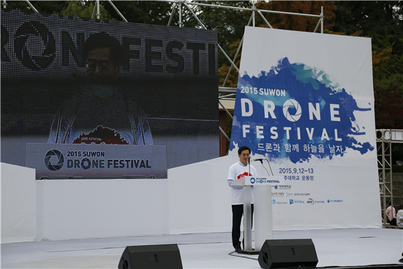 우리 학교와 수원시가 함께 주최한 ‘2015 수원 드론 페스티벌’이 지난 12~13일 우리 학교 운동장 일대에서 열렸다. 이번 페스티벌에는 2만 여명의 시민들이 참석해 성황을 이뤘다. 드론 페스티벌에서는 드론을 주제로 경연과 시연, 전시, 체험 등을 두루 선보였다. 드론 편대의 축하 비행과 드론 비보잉 등의 공연도 펼쳐졌다. 우리 학교 응원단 센토도 공연했다. 또 행사 중 드론 시연을 통해 해난구조, 응급구조, 항공방제 등 드론의 실제 적용 사례를 관객들에게 보여줬다. 국내외 드론 관련 산·학·연·관 기관들이 보조 운동장에 설치한 부스를 통해 다양한 형태의 드론과 부품을 전시하기도 했다. 드론 레이싱 대회, 드론 항공촬영 콘텐츠 대회, 청소년 모형 항공기 대회도 진행됐다. 특히 우리 학교 연구진들이 LINC사업단 주관으로 이번 행사에 직접 참여해 자리를 빛냈다. 아주대 교수진은 드론 및 무인기 관련 연구내용을 직접 체험할 수 있는 부스를 통해 관객과 만났다. 산업공학과 권용진 교수가 유무인기 복합시뮬레이터와 복수무인기 편대비행을, 같은 과 고정한 교수는 3D 프린터를 활용한 드론제작을 선보였다. 그밖에도 국방전술데이터 링크 시뮬레이터 체험(국방디지털융합학과 백호기 교수), 무인자동차와 드론의 만남(기계공학과 송봉섭 교수) 등이 소개됐다. 행사 첫날 권용진 교수가 이끄는 가 '드론(Drone)이 가져올 Innovation'을 주제로 드론산업 발전에 대한 학술세미나도 개최했다. 세미나에는 6명의 드론 산·학·연 전문가가 초대됐다. 염태영 수원시장은 “최적의 인프라를 갖춘 수원시가 드론 산업을 선도하는 도시로 나아가고자 한다”며 “삼성전자와 관련 기업 600여개가 위치하고 있고 아주대학교를 비롯한 우수한 교육기관의 인력풀을 활용할 수 있다는 점에서 수원이 드론 선도 도시가 되기에 부족함이 없다”고 말했다. 우리 학교 김동연 총장은 “드론 산업이 초기 단계이지만 이미 시장 규모가 20억달러 수준에 와 있고 관련 스타트업과 산업이 급성장 추세에 있다”며 “아주대가 수원시와 함께 드론 산업 발전에 동참하고자 한다”고 전했다. 김진표 우리 학교 공공정책대학원 초빙교수(전 국회의원)와 우리 학교 총학생회장 출신 김상민 국회의원도 행사에 참석, 축사했다. 무인 비행기 드론(drone)은 20세기 초 군사용으로 만들어졌고 최근 그 활용 범위가 경찰 수사, 재난 구호, 농업, 물류 배송 등으로 넓어지고 있다.