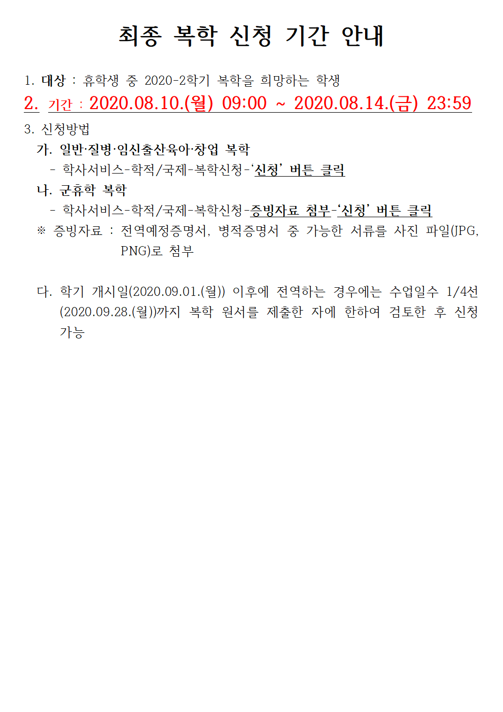 [학부]2020-2학기 최종 복학 신청 기간 안내(8/10~8/14)